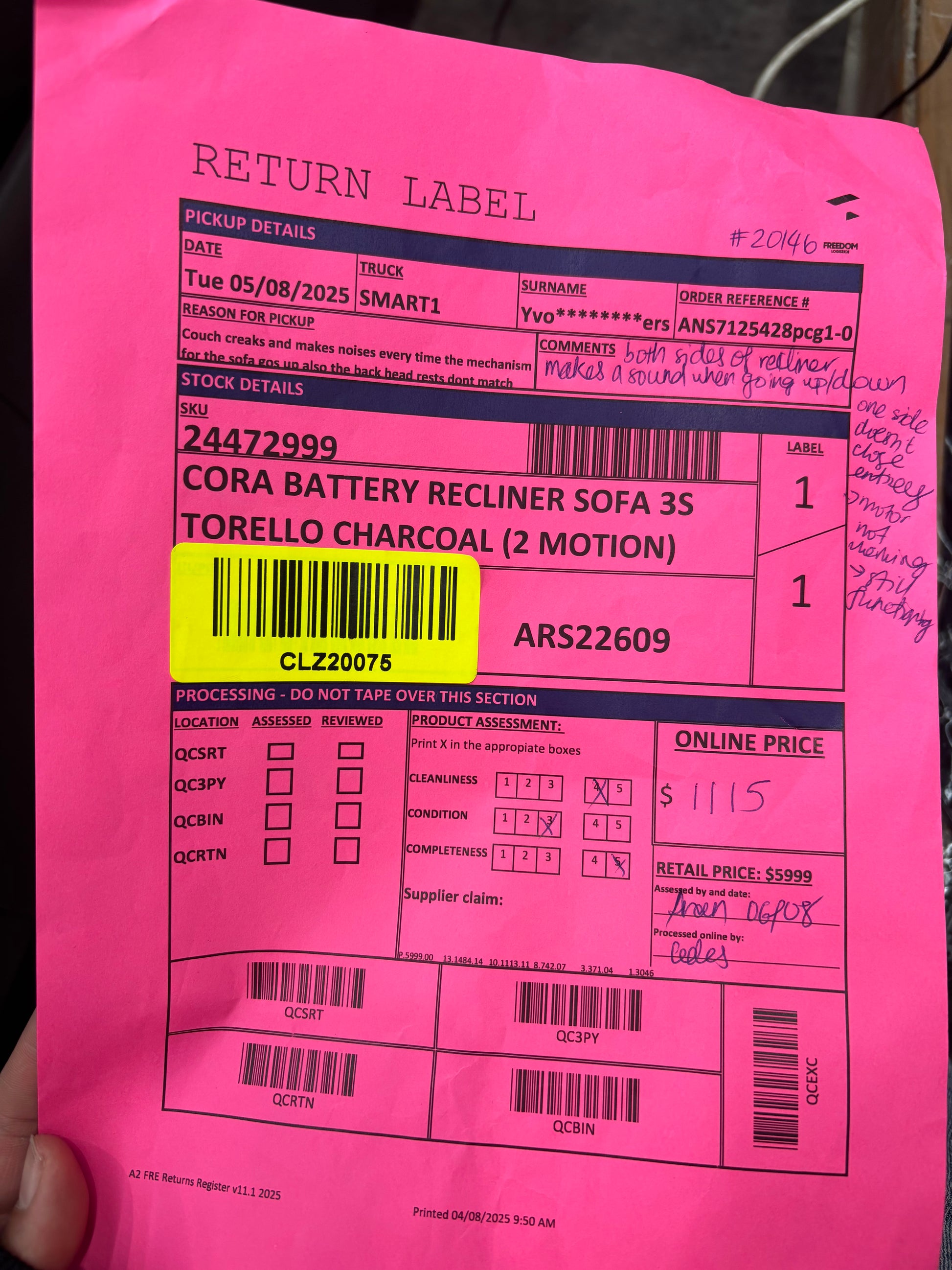RETURN REASON: Couch creaks and makes noises every time the mechanism for the sofa goes up and also the back head rests don't match.Â