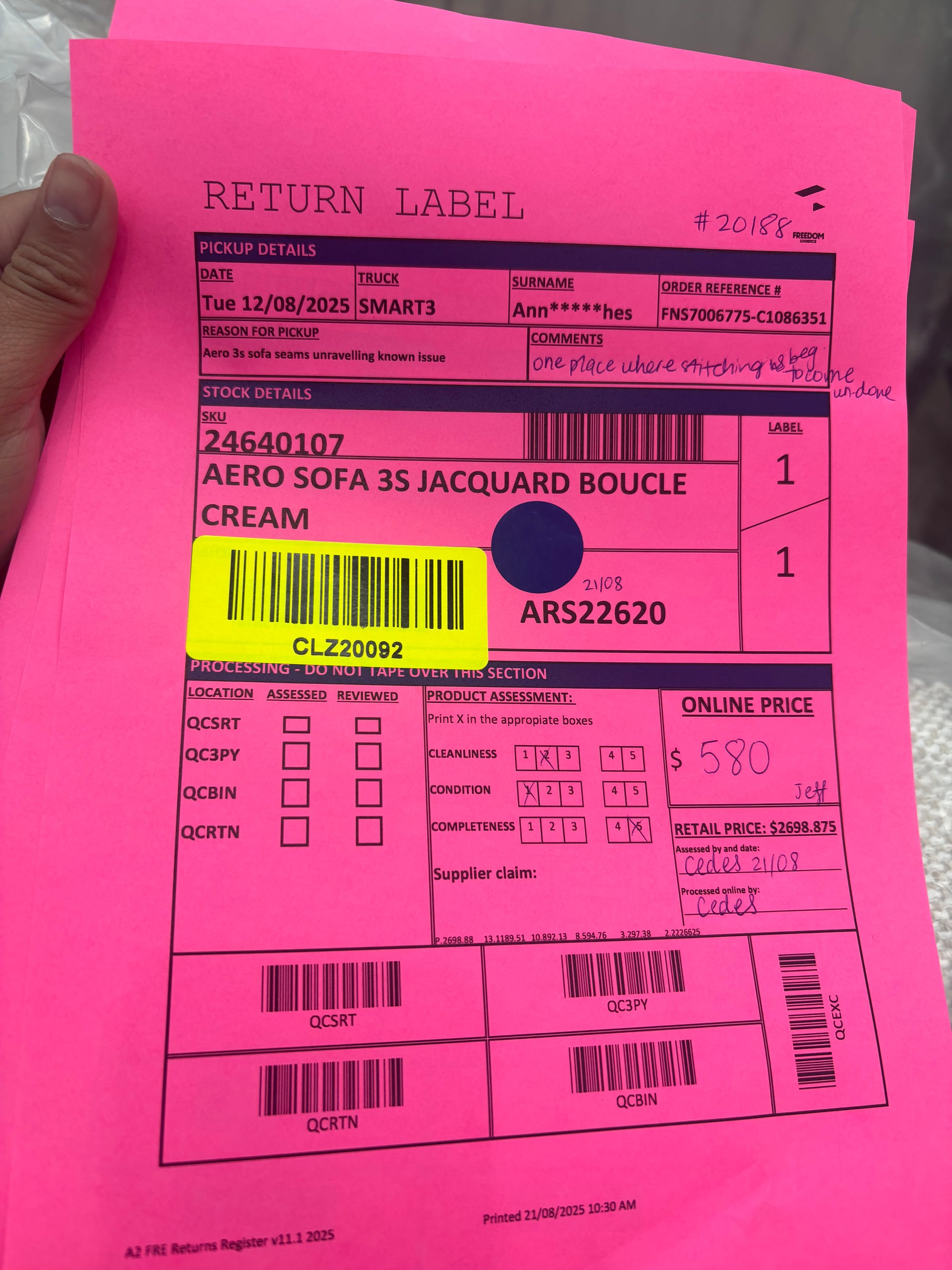 RETURN REASON: Aero 3S Sofa seams unravelling
