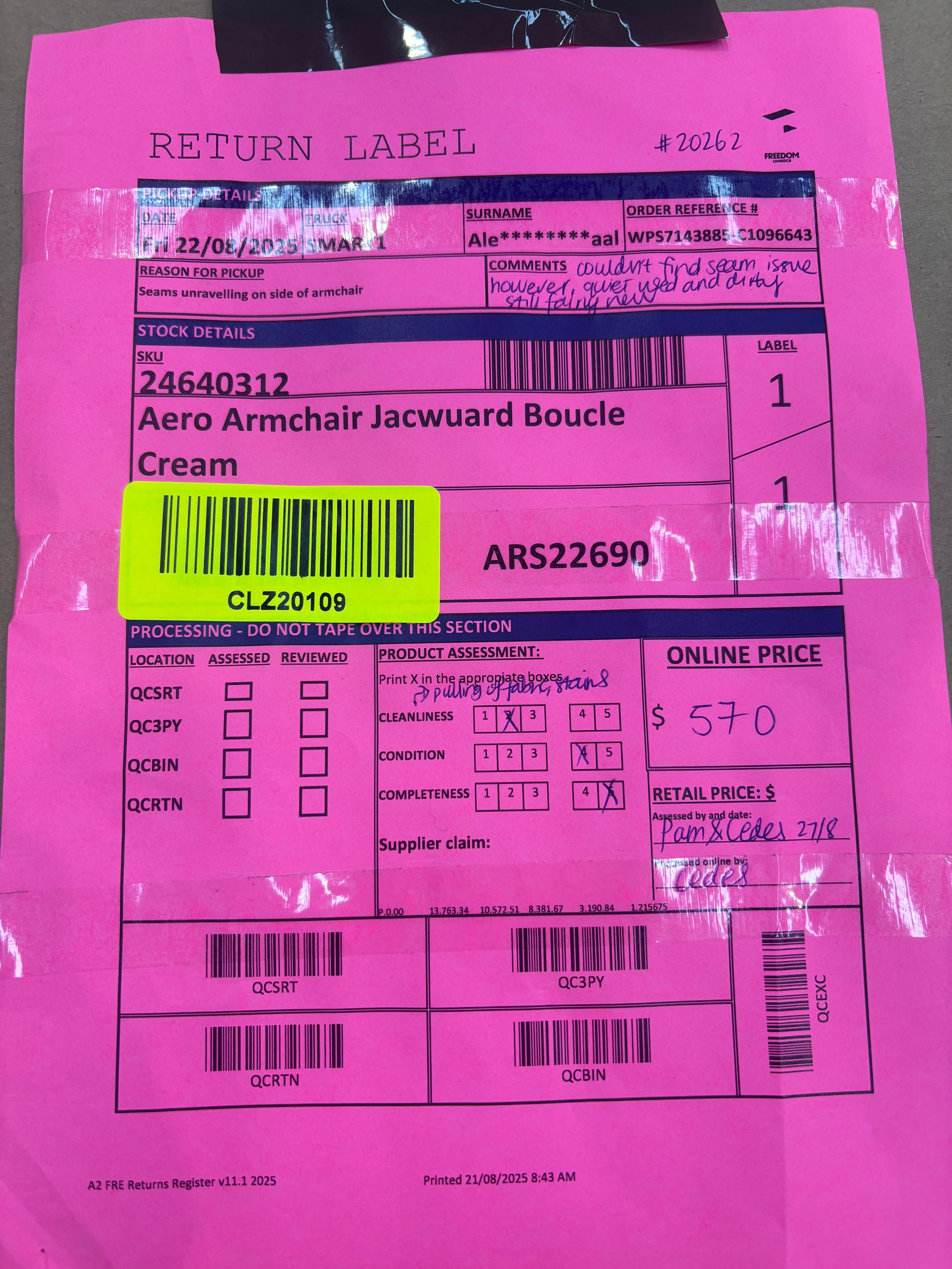 ASSESSOR NOTES: Couldn't find seam issue however, armchair has been used. Quite stained and dirty but fairly new.Β
