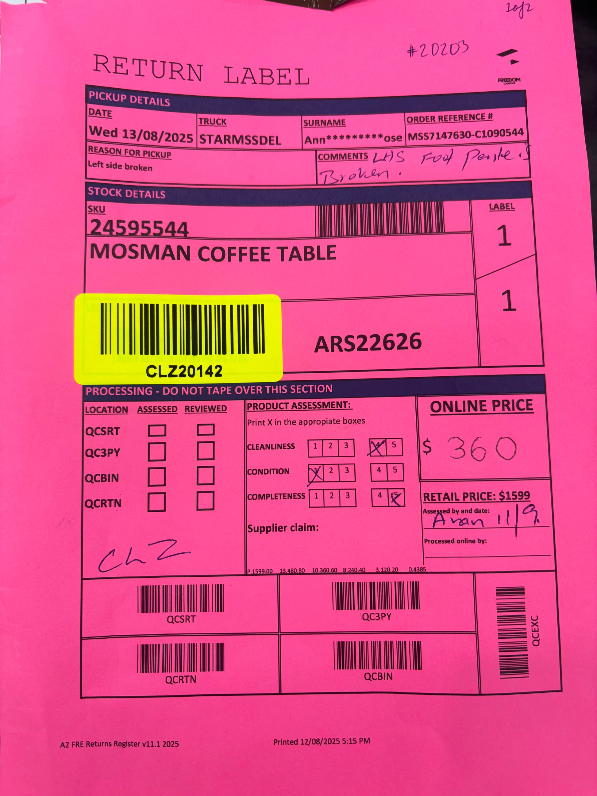 ASSESSOR NOTES: Left hand side resting foot is broken. Table still stable.