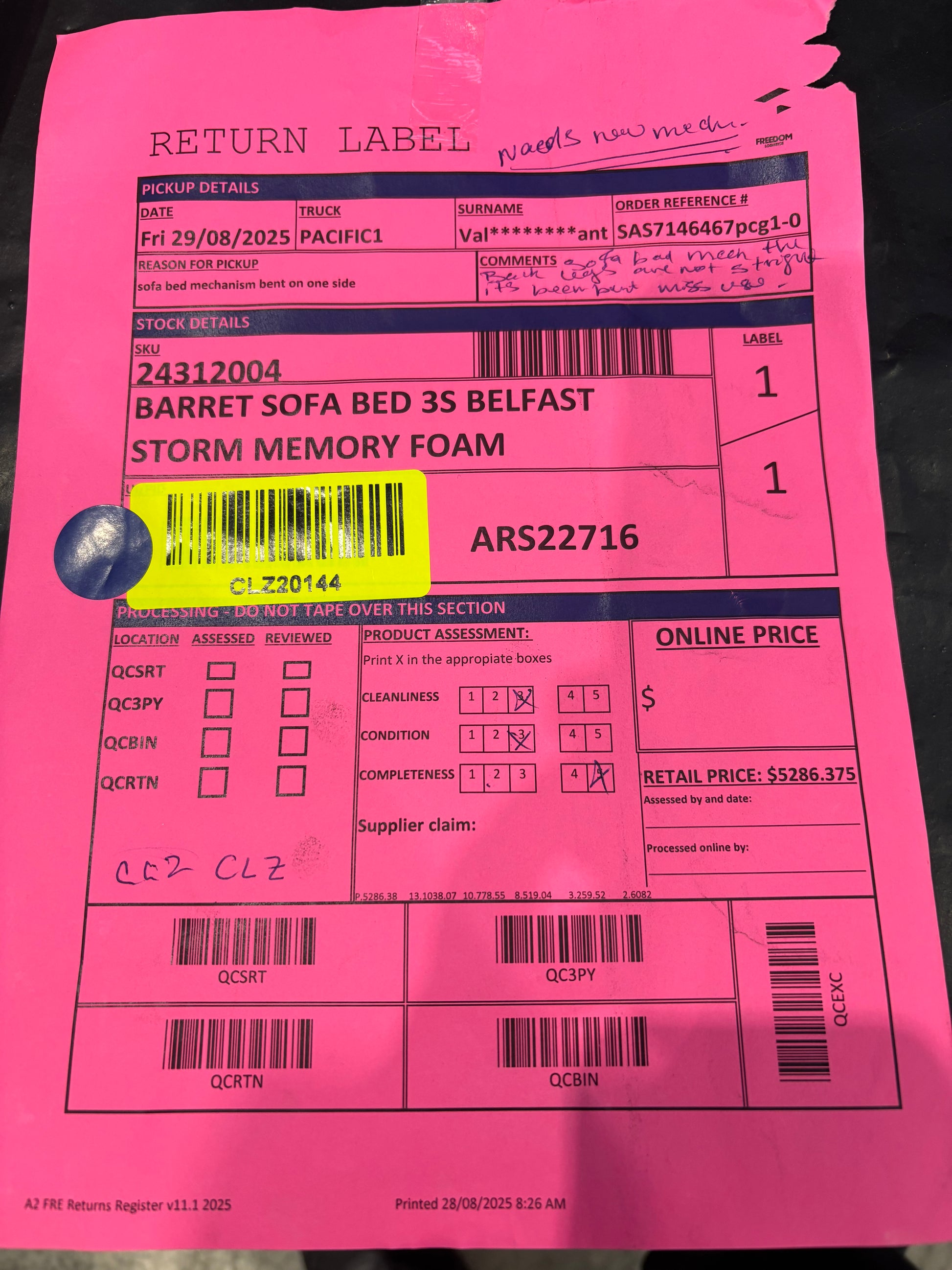 ASSESSOR NOTES: Sofa bed mechanism on the back legs are not straight as it's been bent due to miss-use. Will require new mechanism.Β