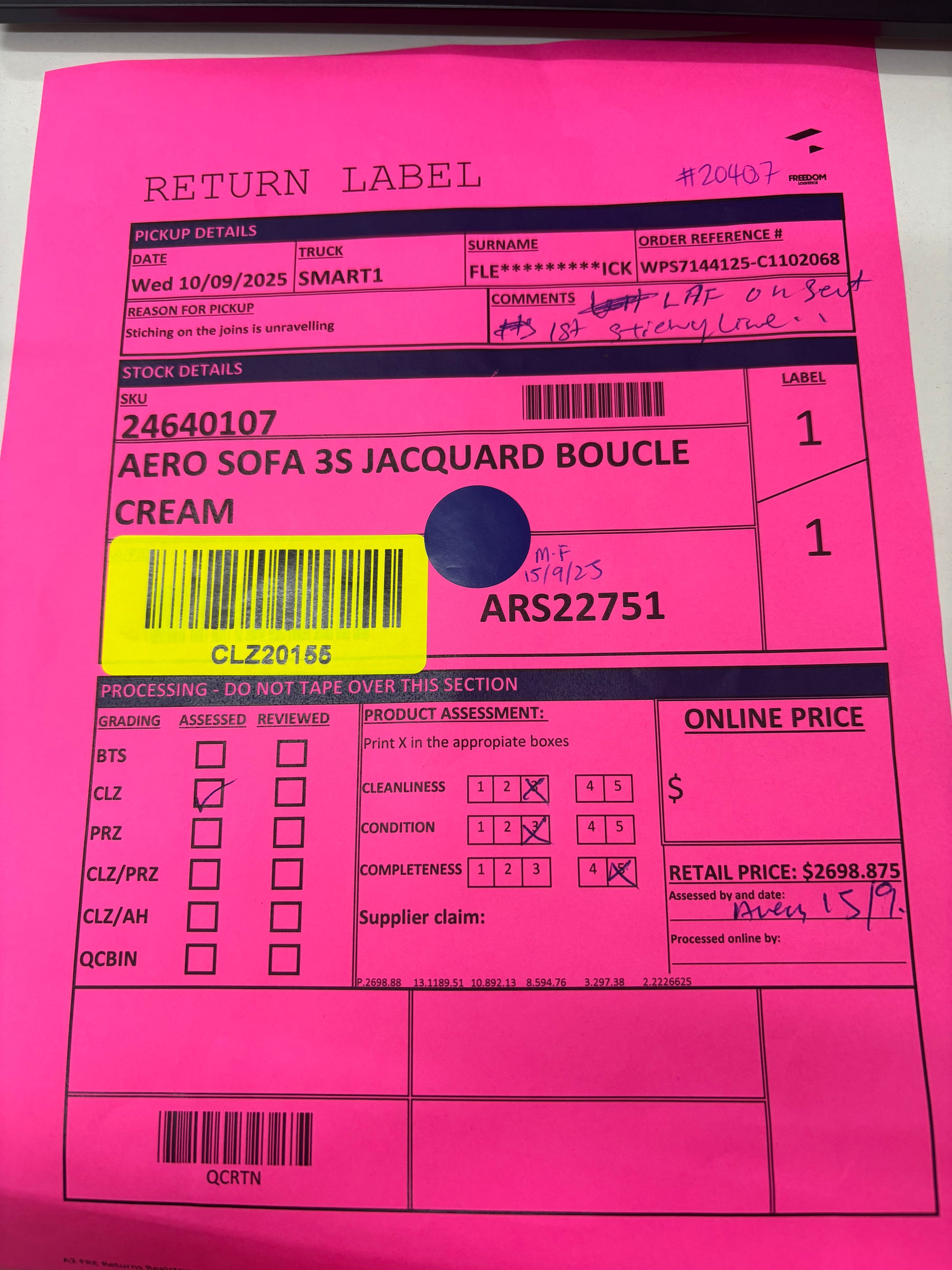 NZ CLZ20155 Aero Sofa 3S Jacquard Boucle Cream