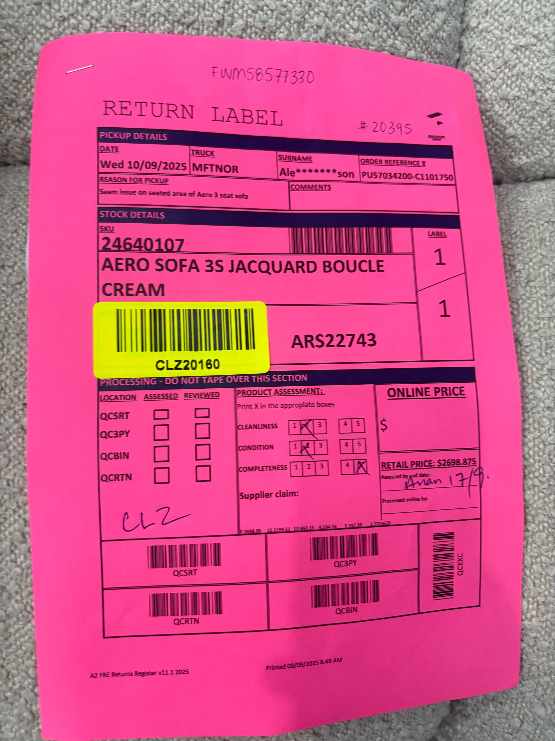 ASSESSOR NOTES: Seam issue