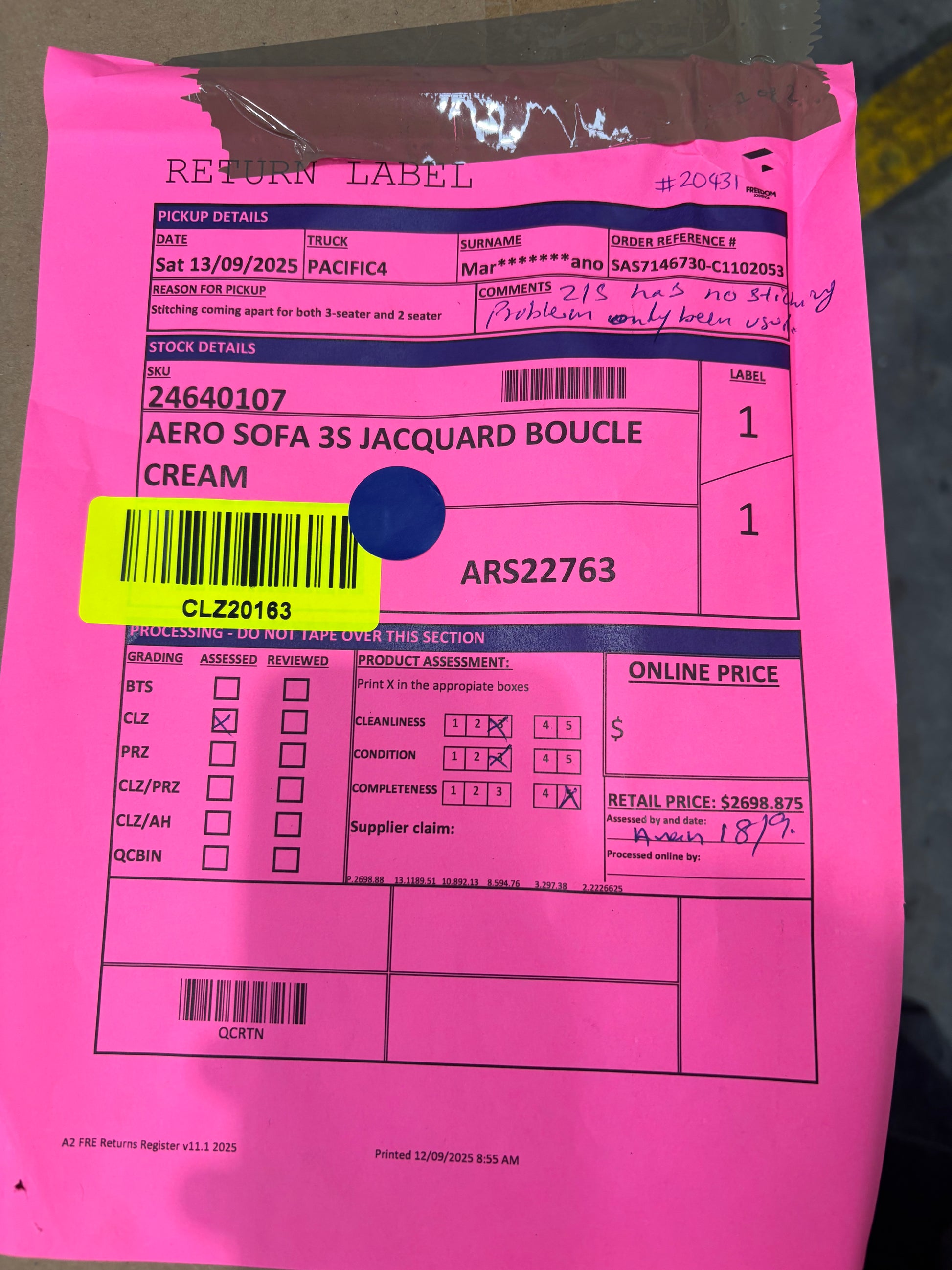 RETURN REASON: Stitching coming apart