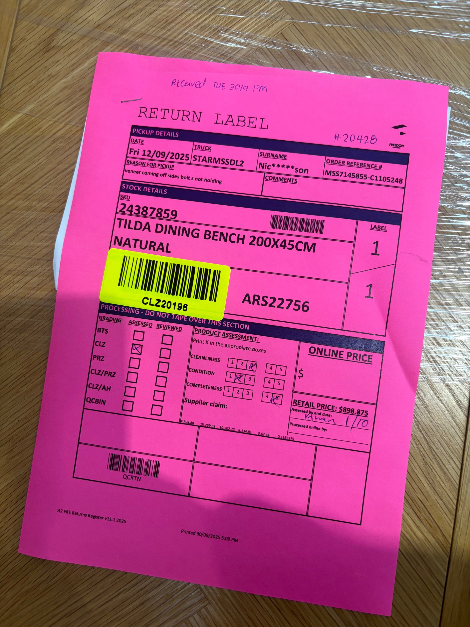 RETURN REASON: Veneer coming off the sides, bolts not holding