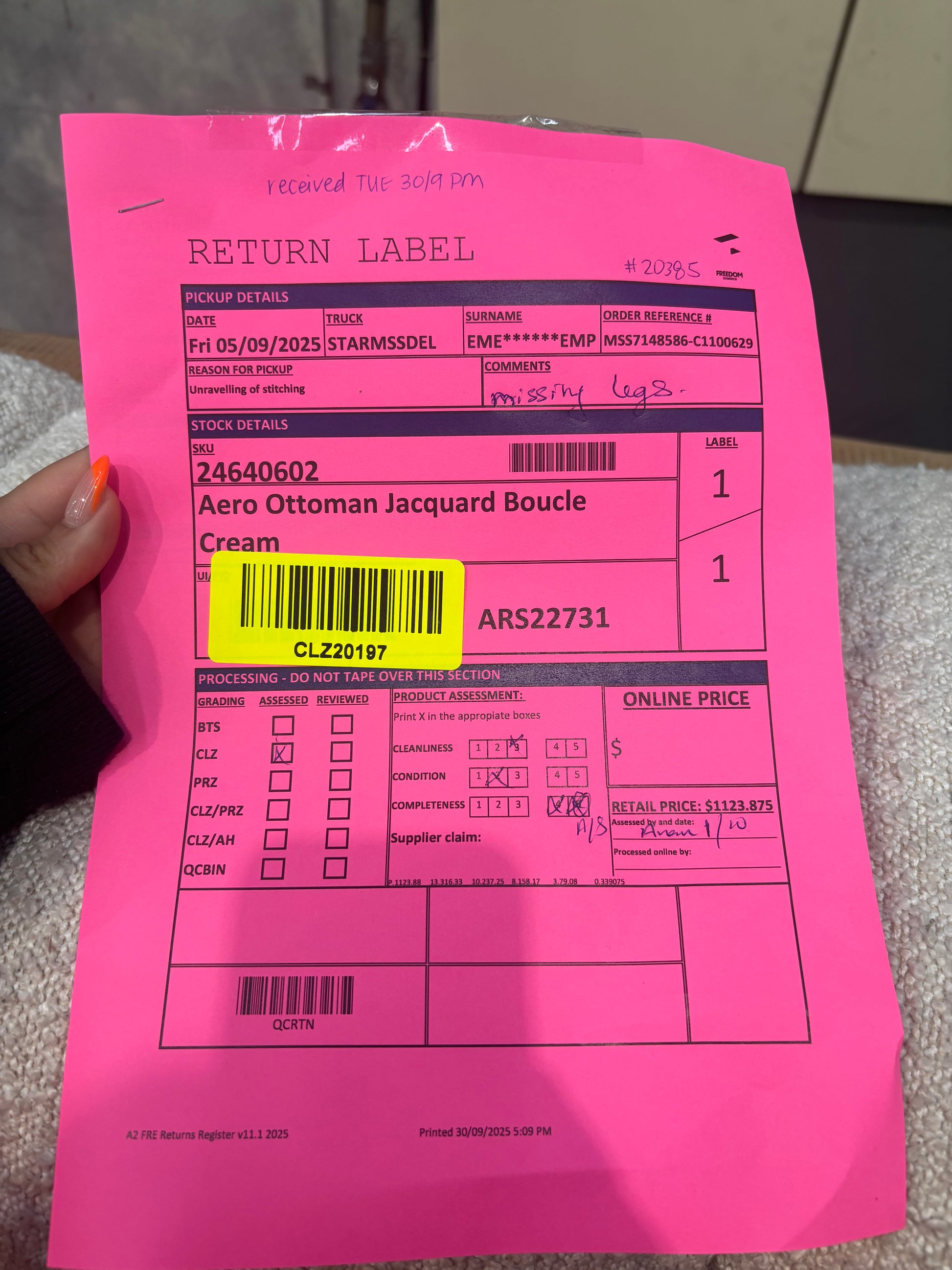 RETURN REASON: Unravelling of stitching