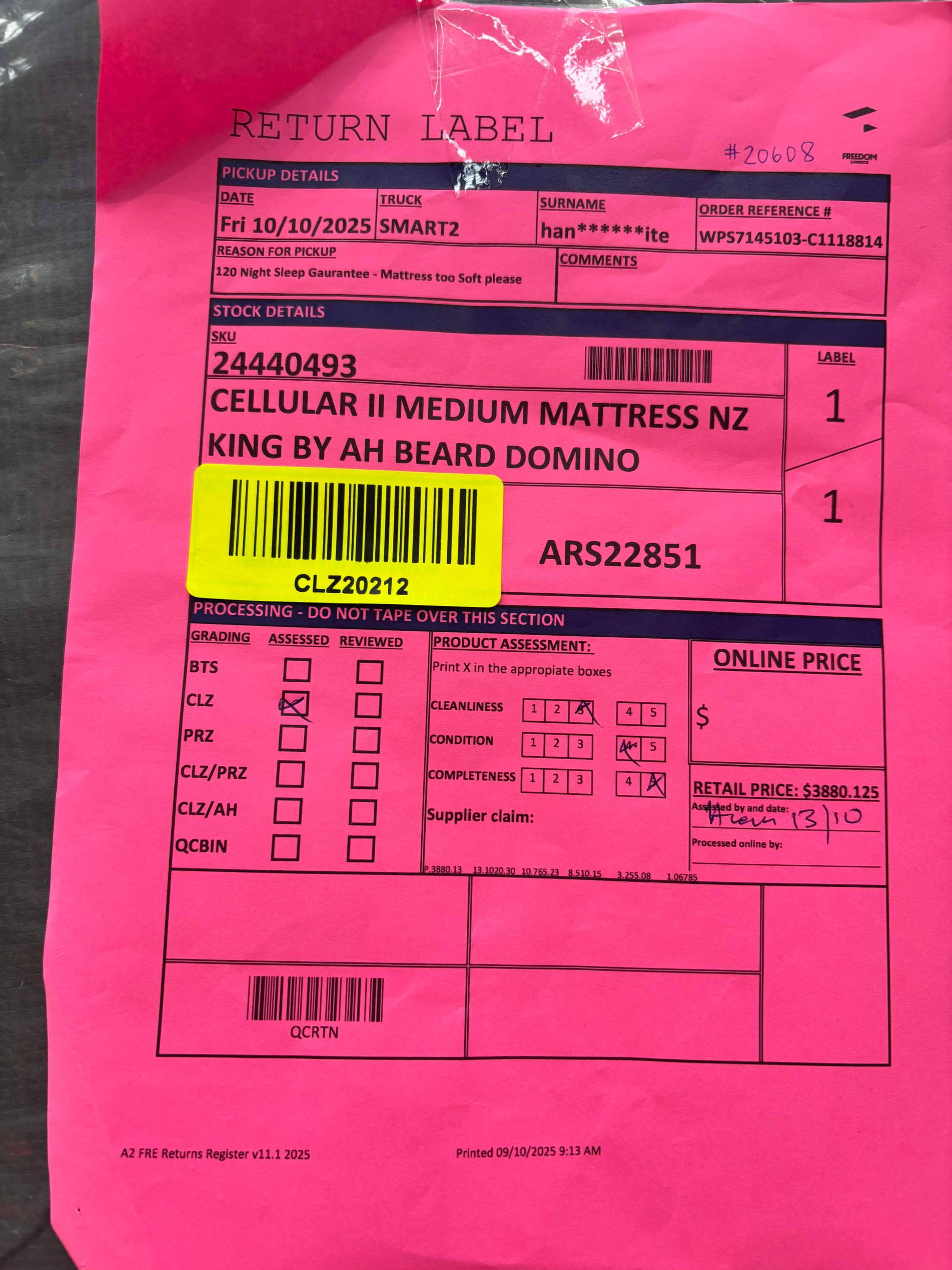 RETURN REASON: 120 Night Sleep Guarantee - Mattress too soft