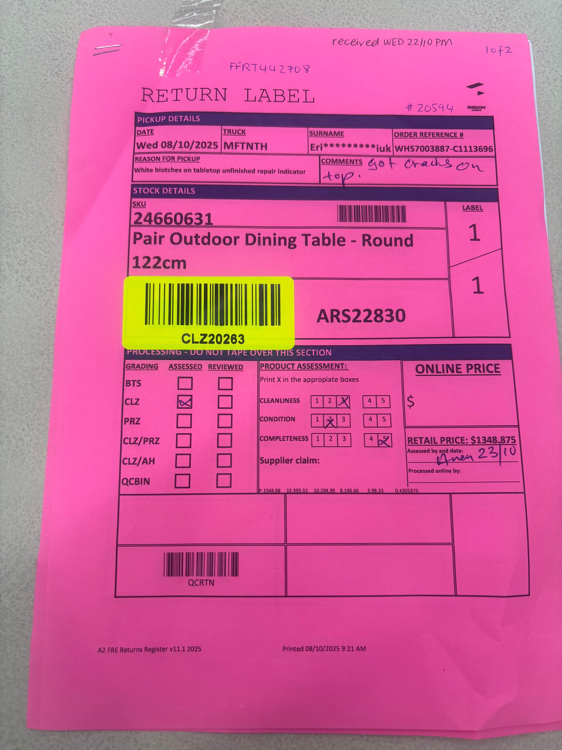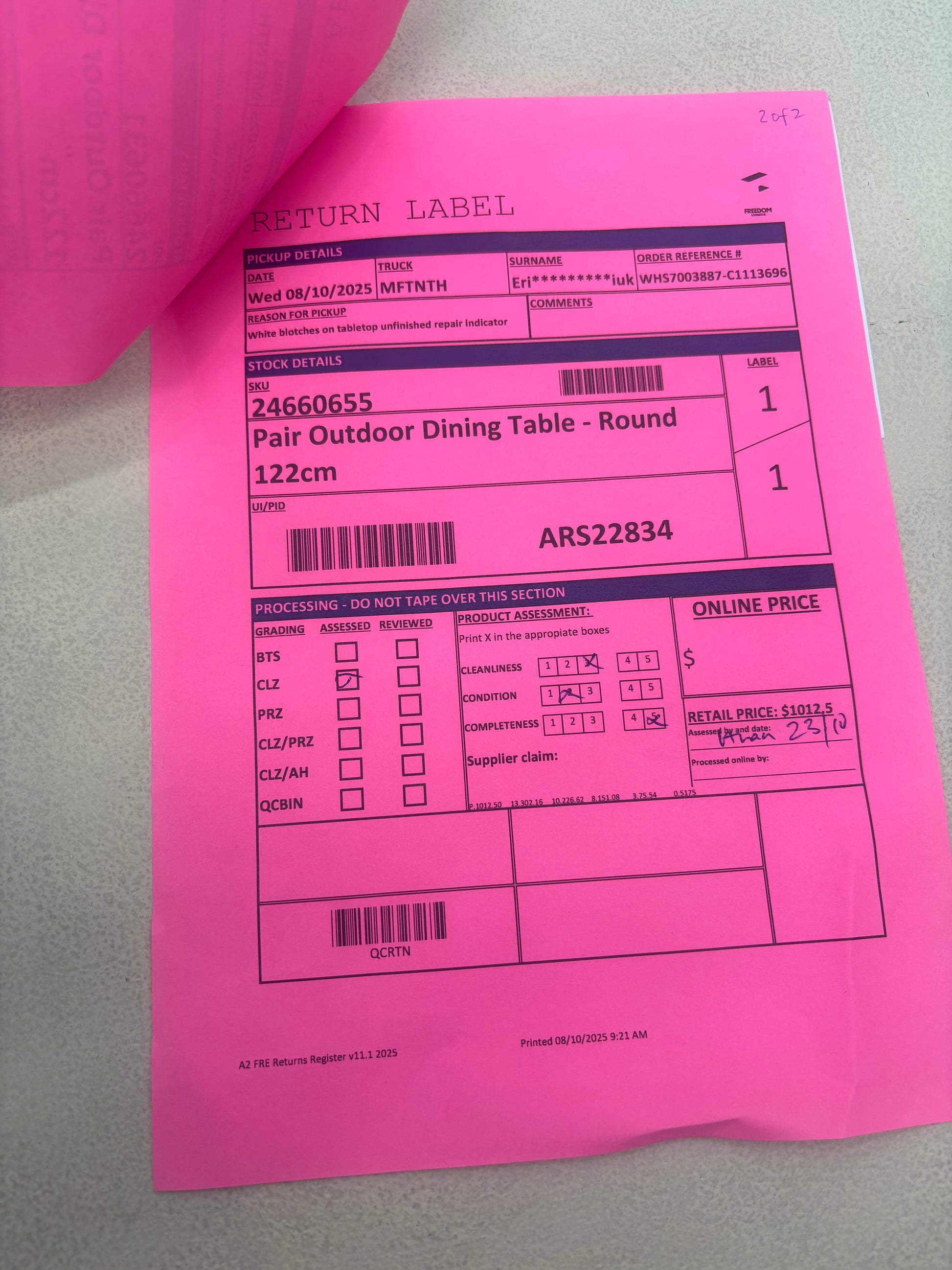 RETURN REASON: White blotches on tabletop, unfinished repair indicator