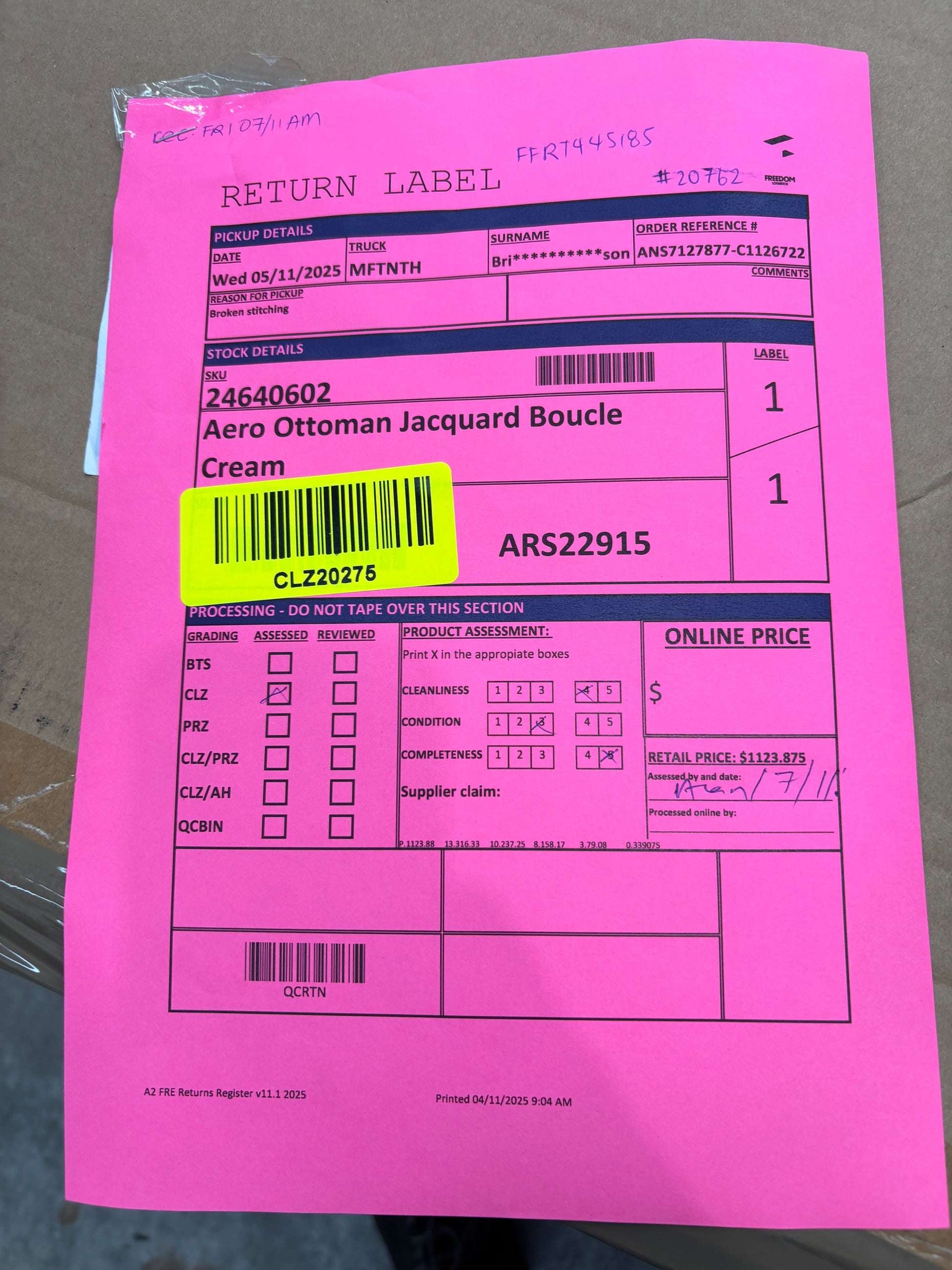 RETURN REASON: Broken stitching