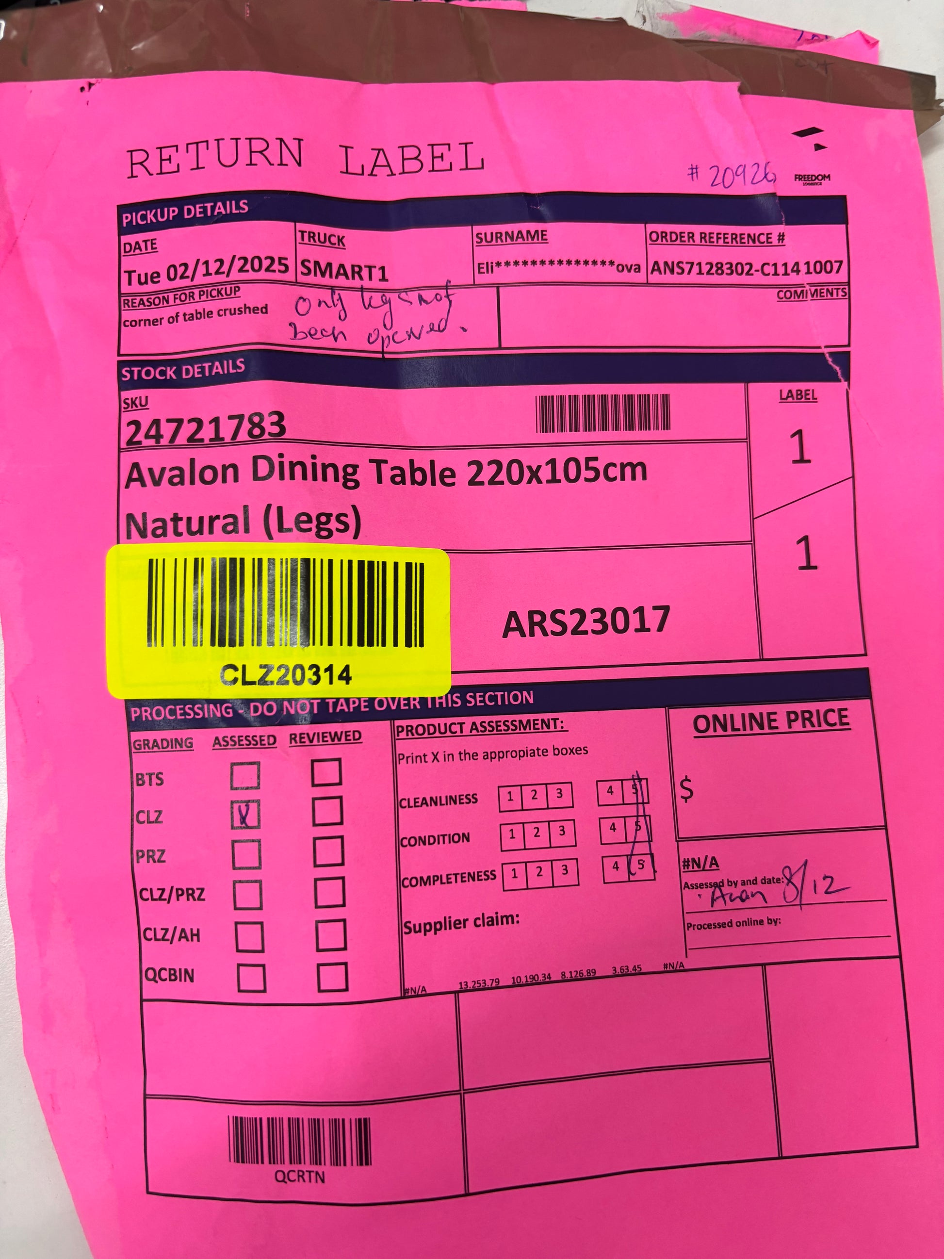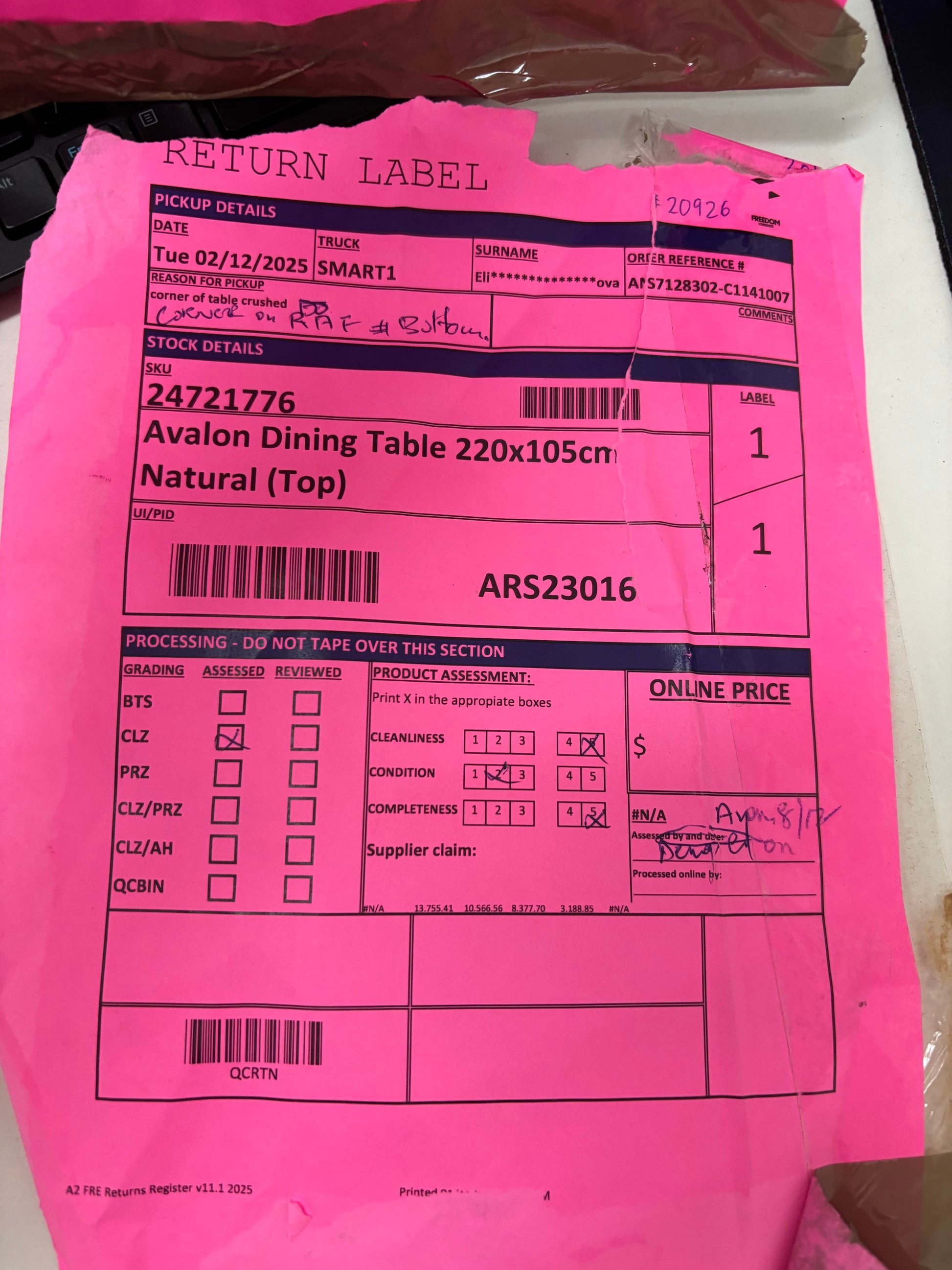 ASSESSORS NOTES: Table still in original packaging, legs haven't been opened. Checked all corners, only x1 corner damaged.Β