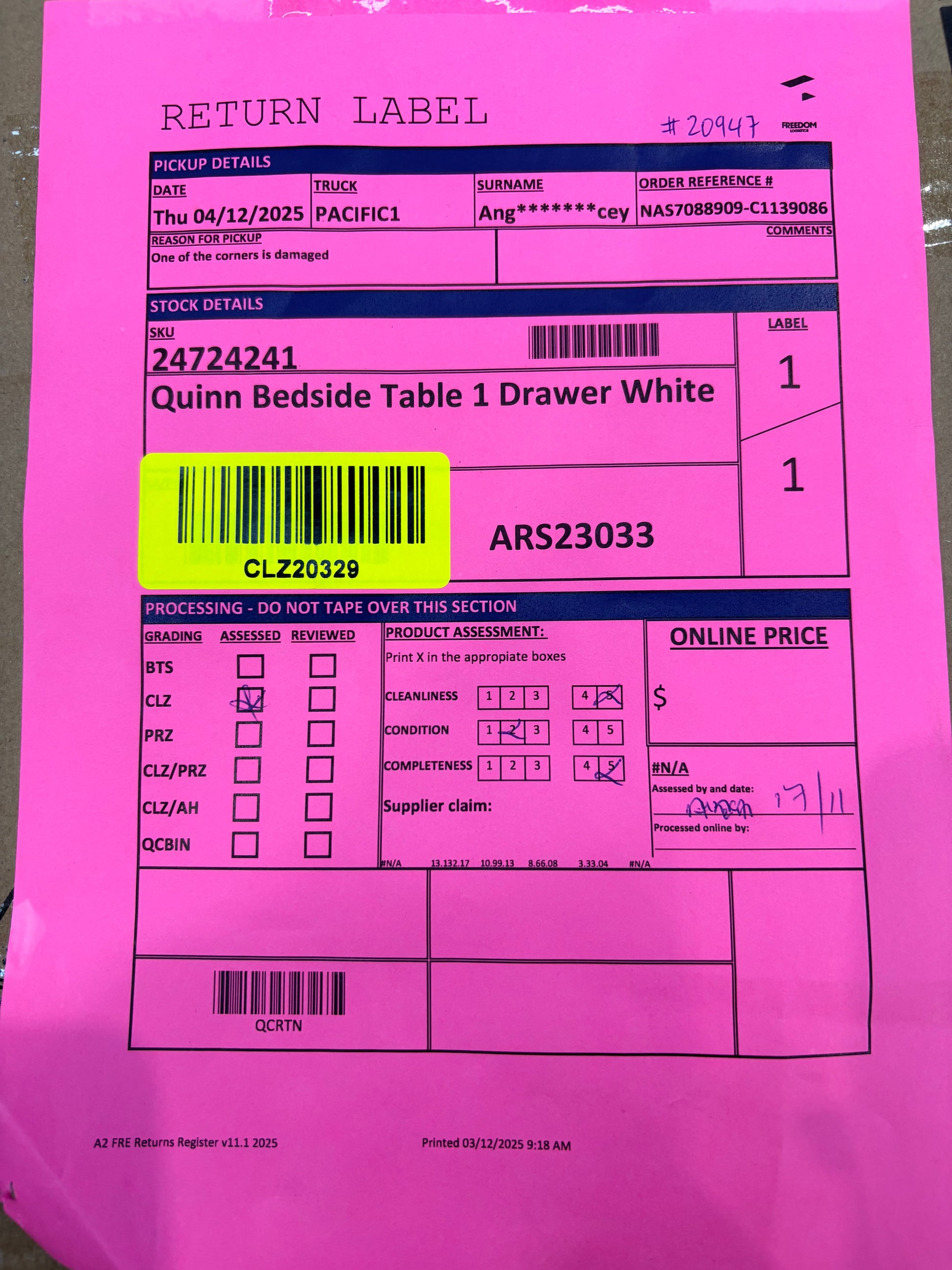 NZ CLZ20329 Quinn Bedside Table 1 Drawer White