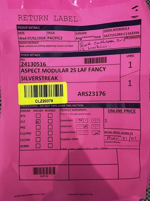 RETURN REASON: Back cushions zip is broken and appearing are uneven wrinkled.Β