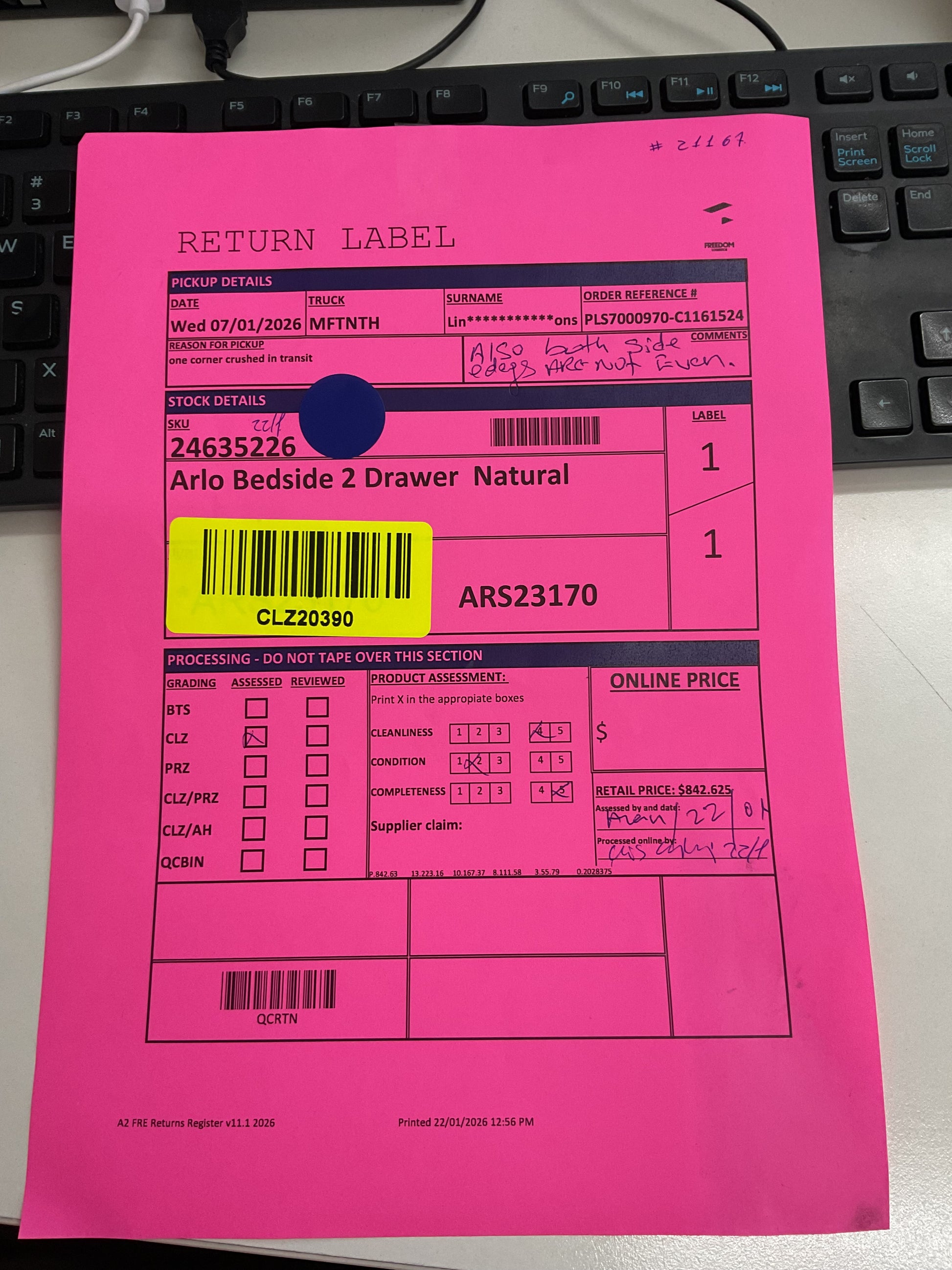 RETURN REASON: The right corner is damaged, and the left-side edges are uneven
