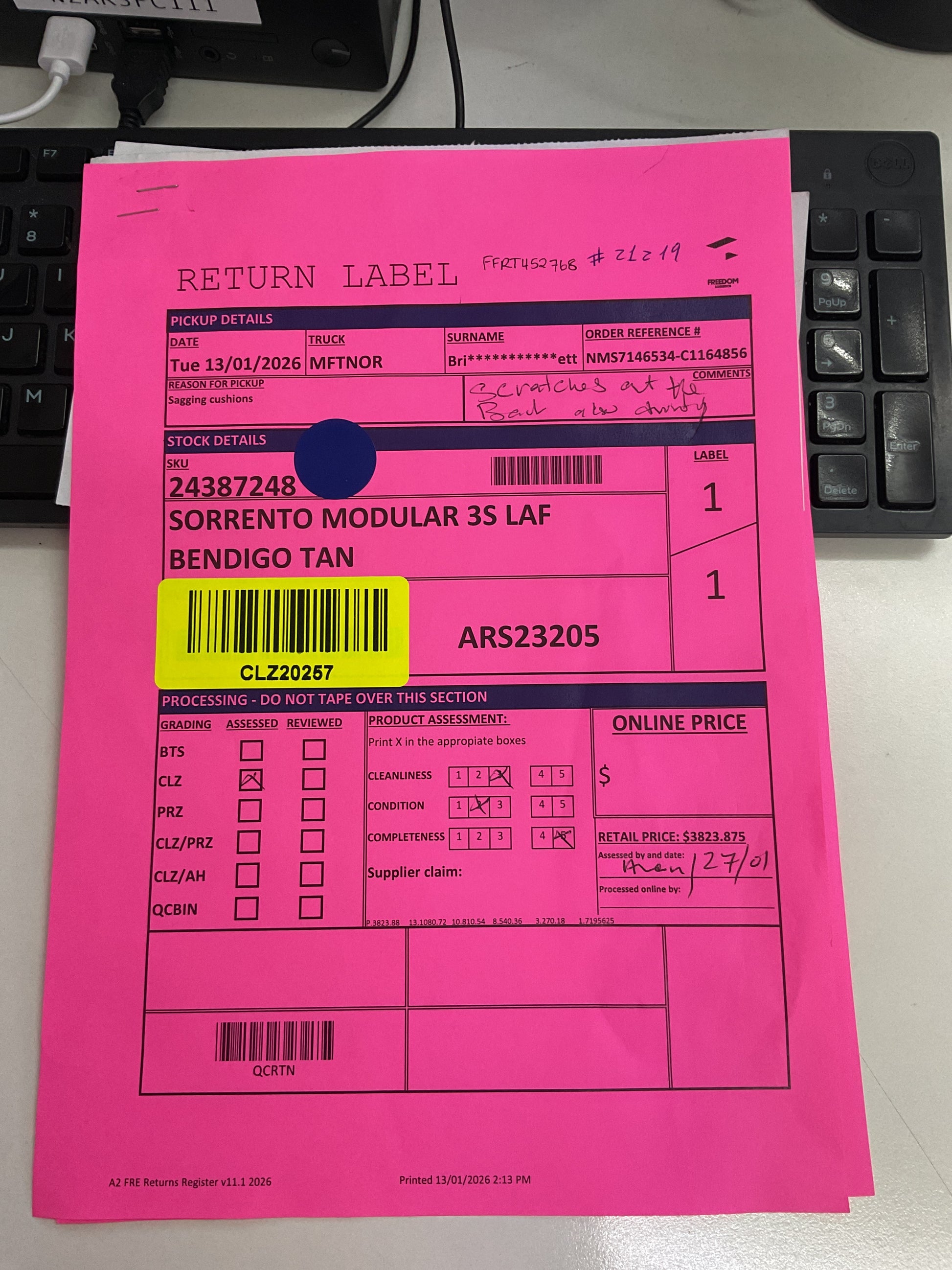 RETURN REASON: Sagging cushions and scratches on the back of the sofa.Β