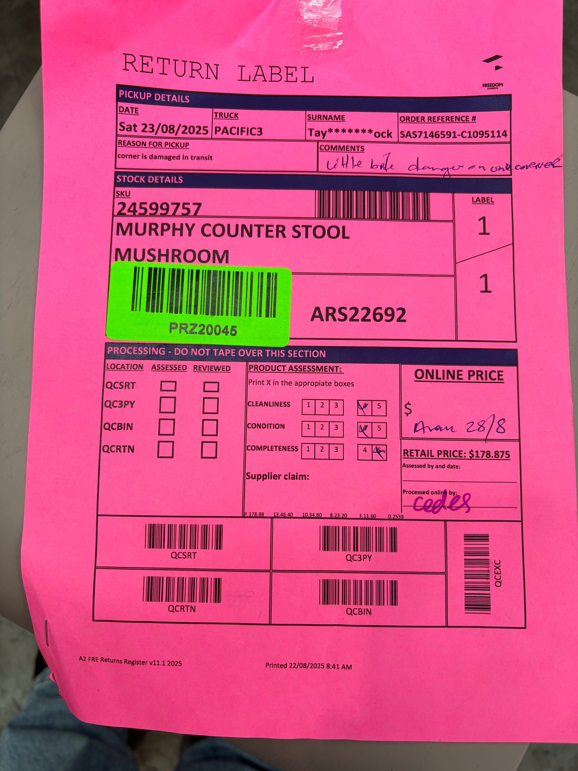 RETURN REASON: Corner is damaged