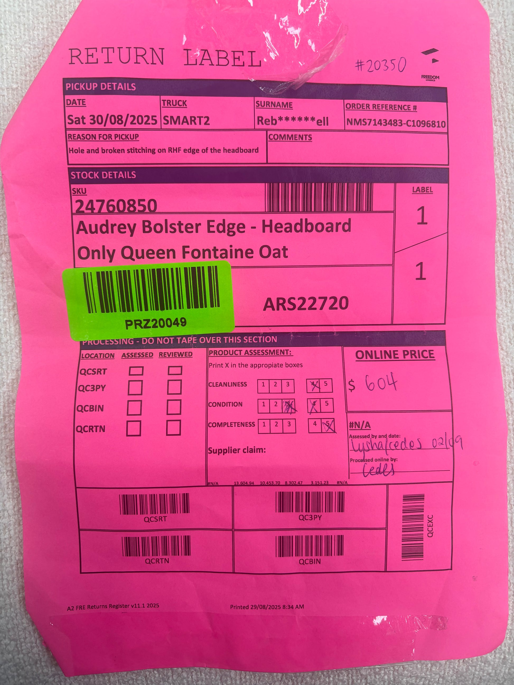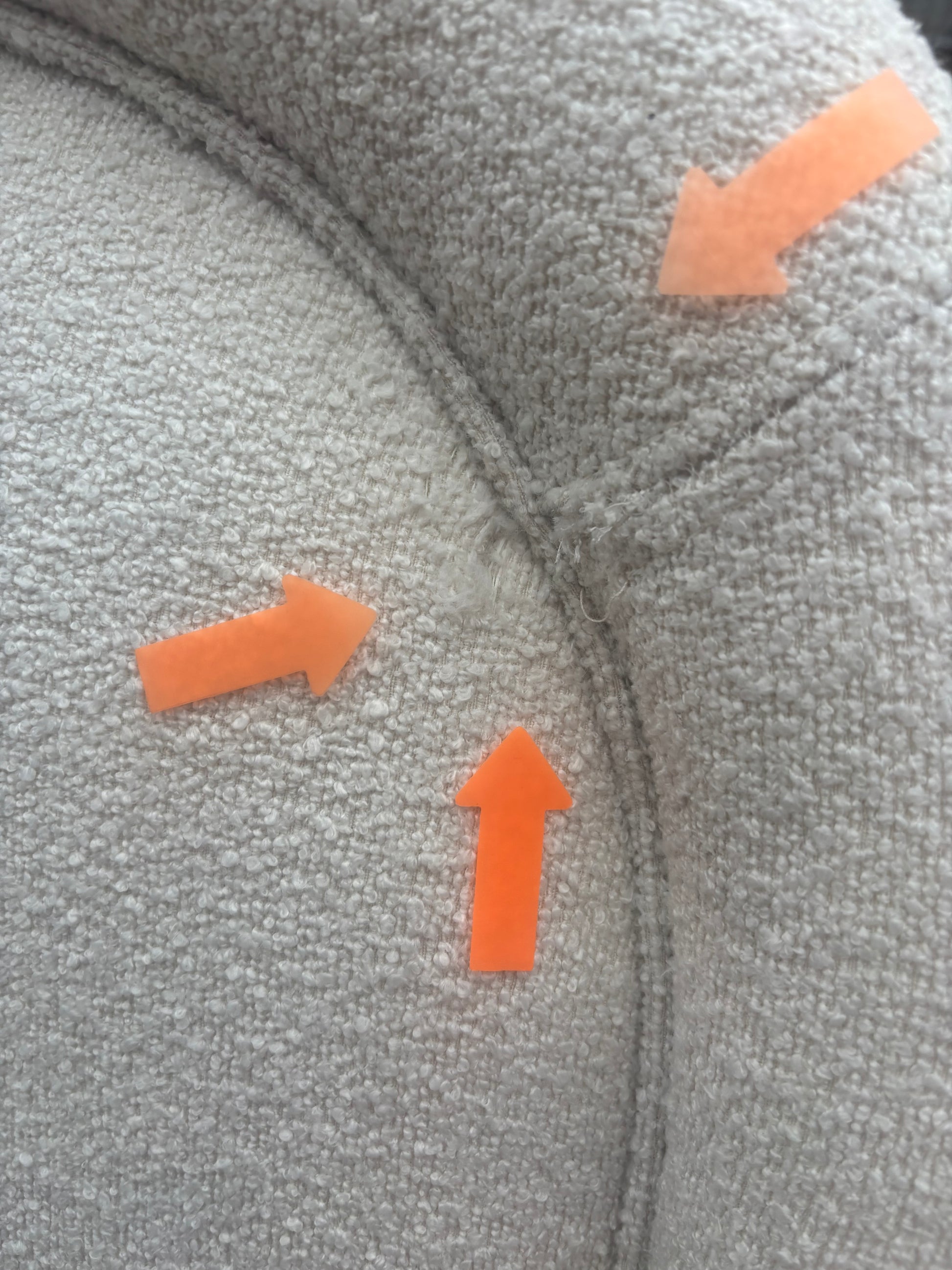 RETURN REASON: Hole and broken stitching on right-hand facing edge of the headboard