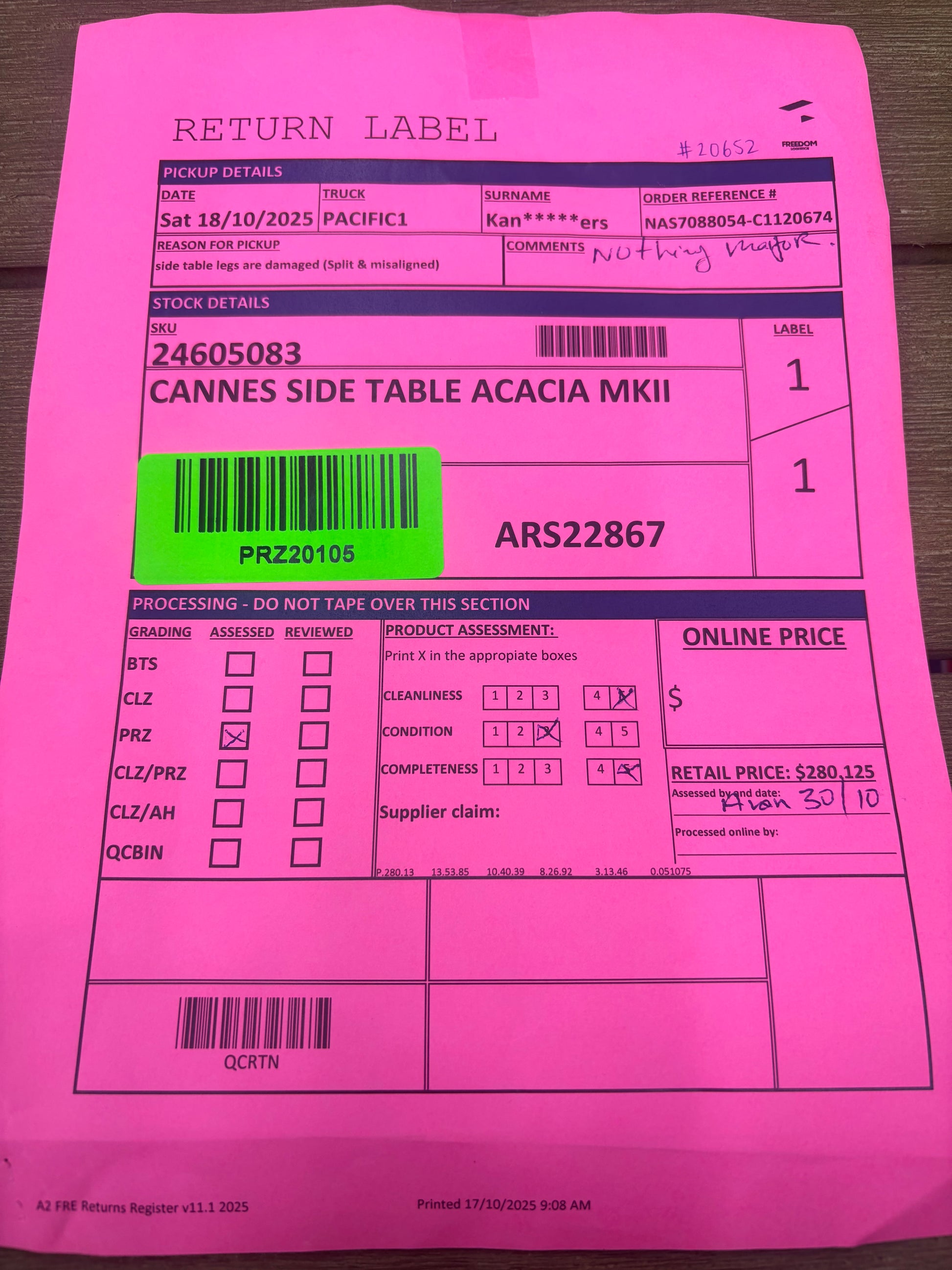 RETURN REASON: Side table legs are damaged (splits & misaligned)