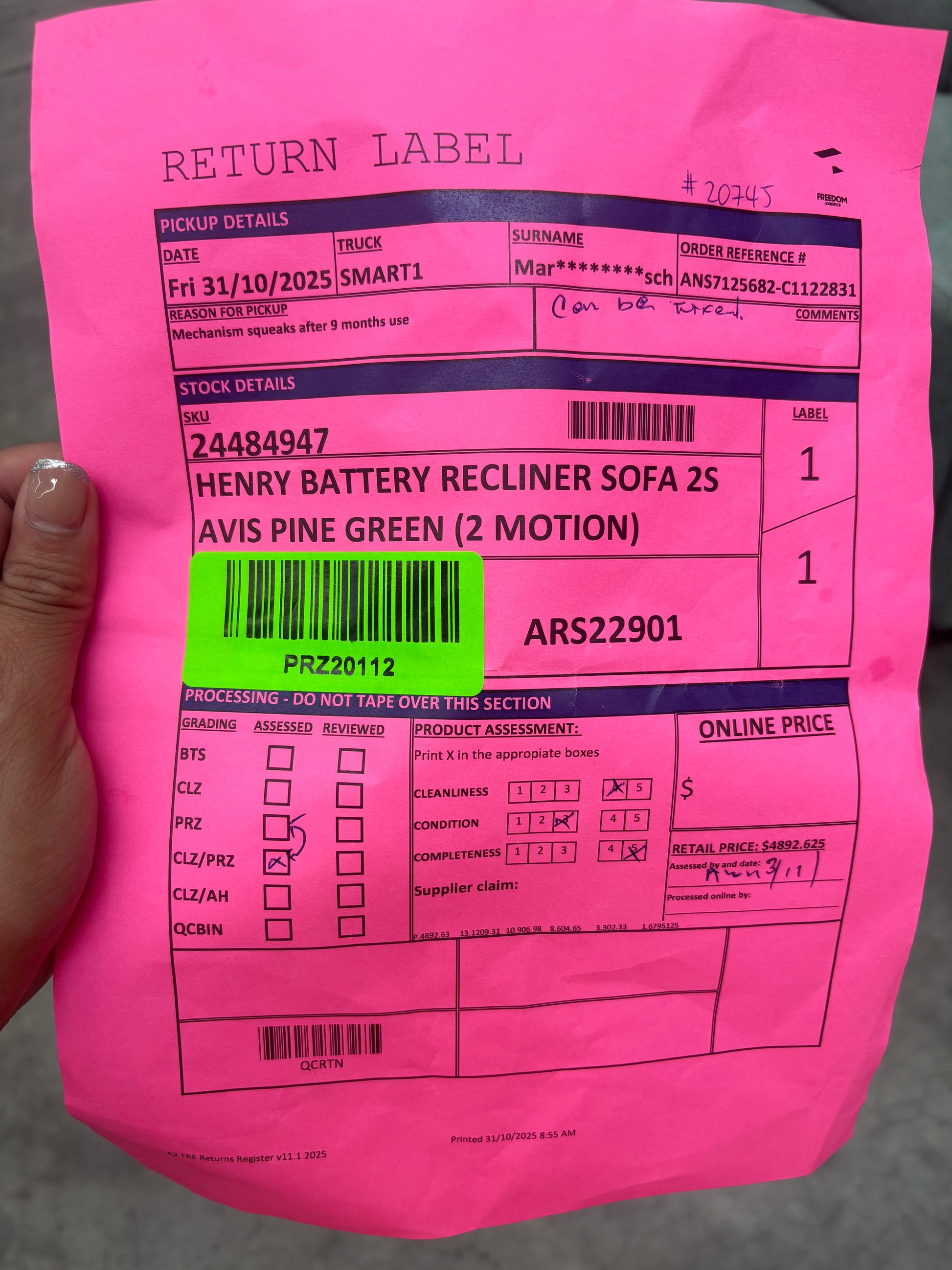 RETURN REASON: Mechanism squeaks after 9 months of use