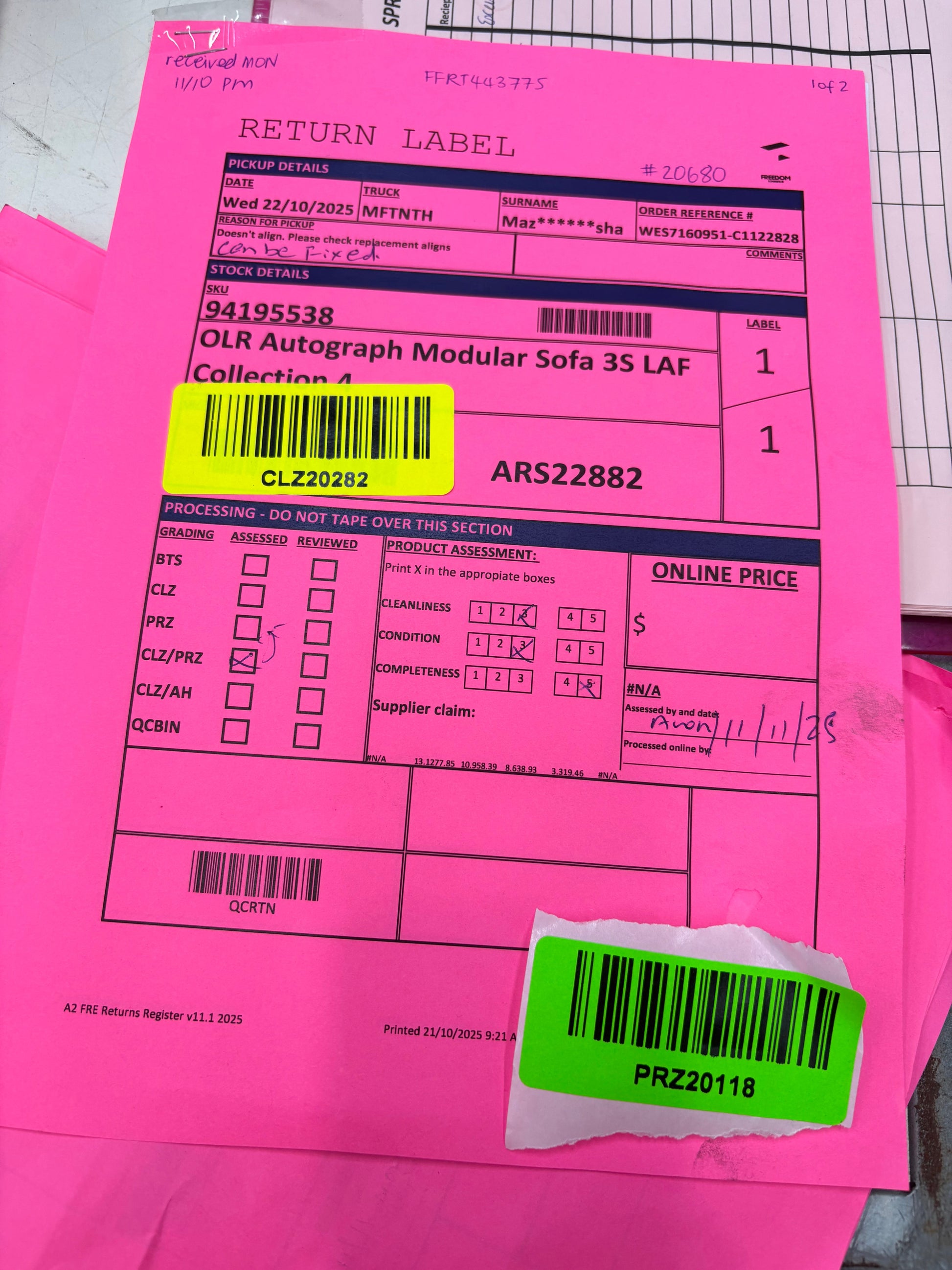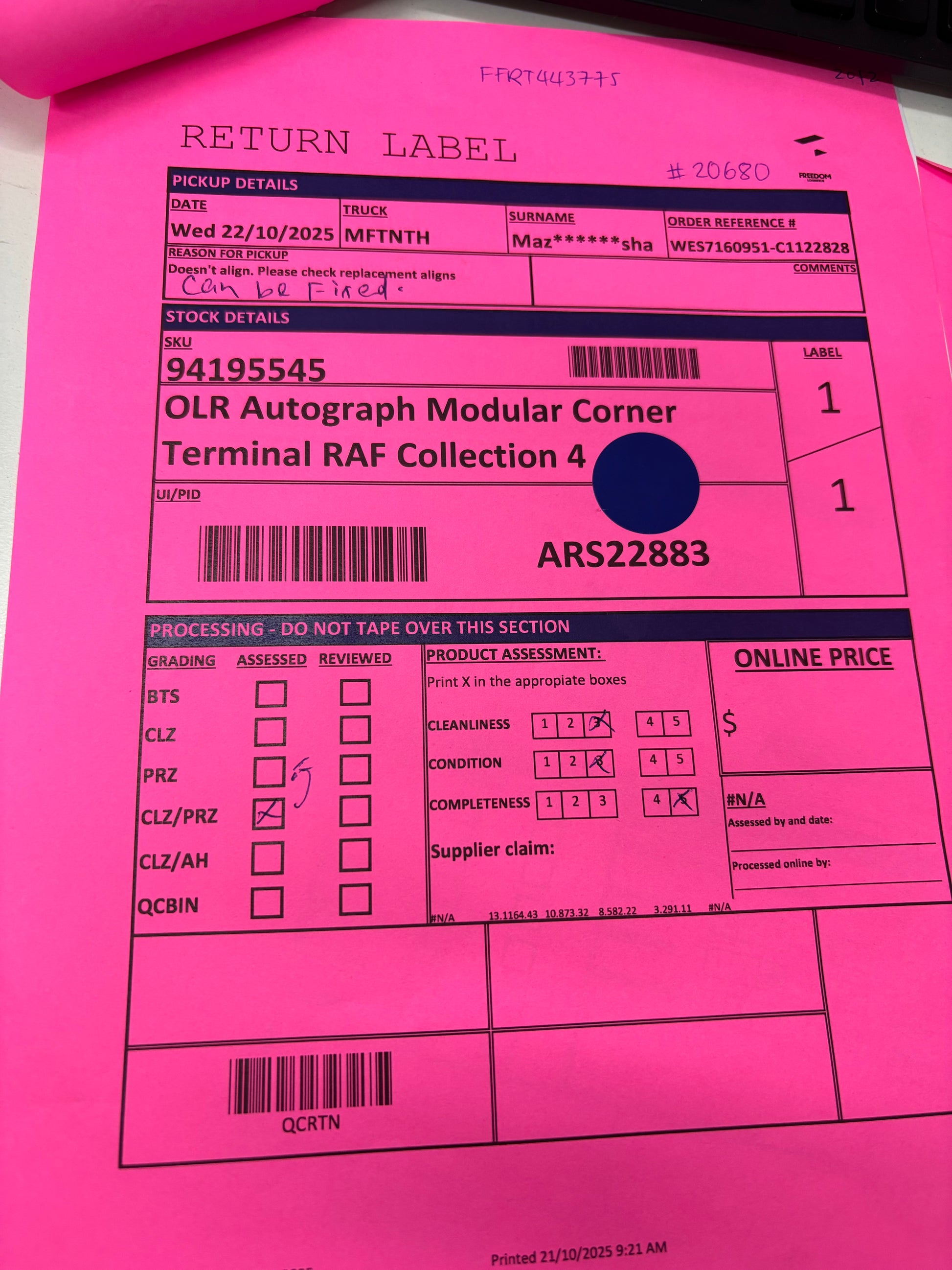 RETURN REASON: x2 pieces don't align.Β