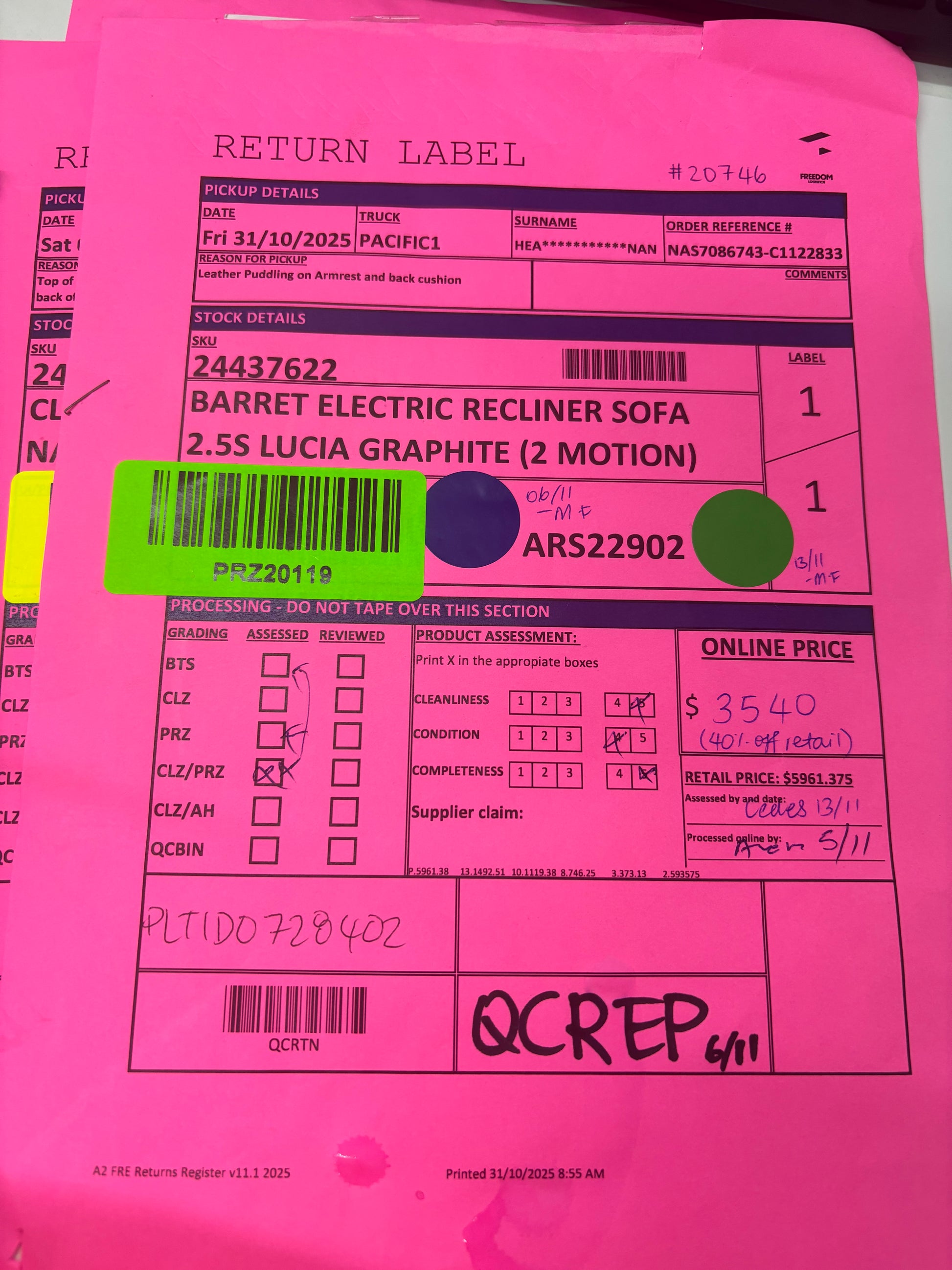 RETURN REASON: Leather puddling on armrest and back cushion.Β