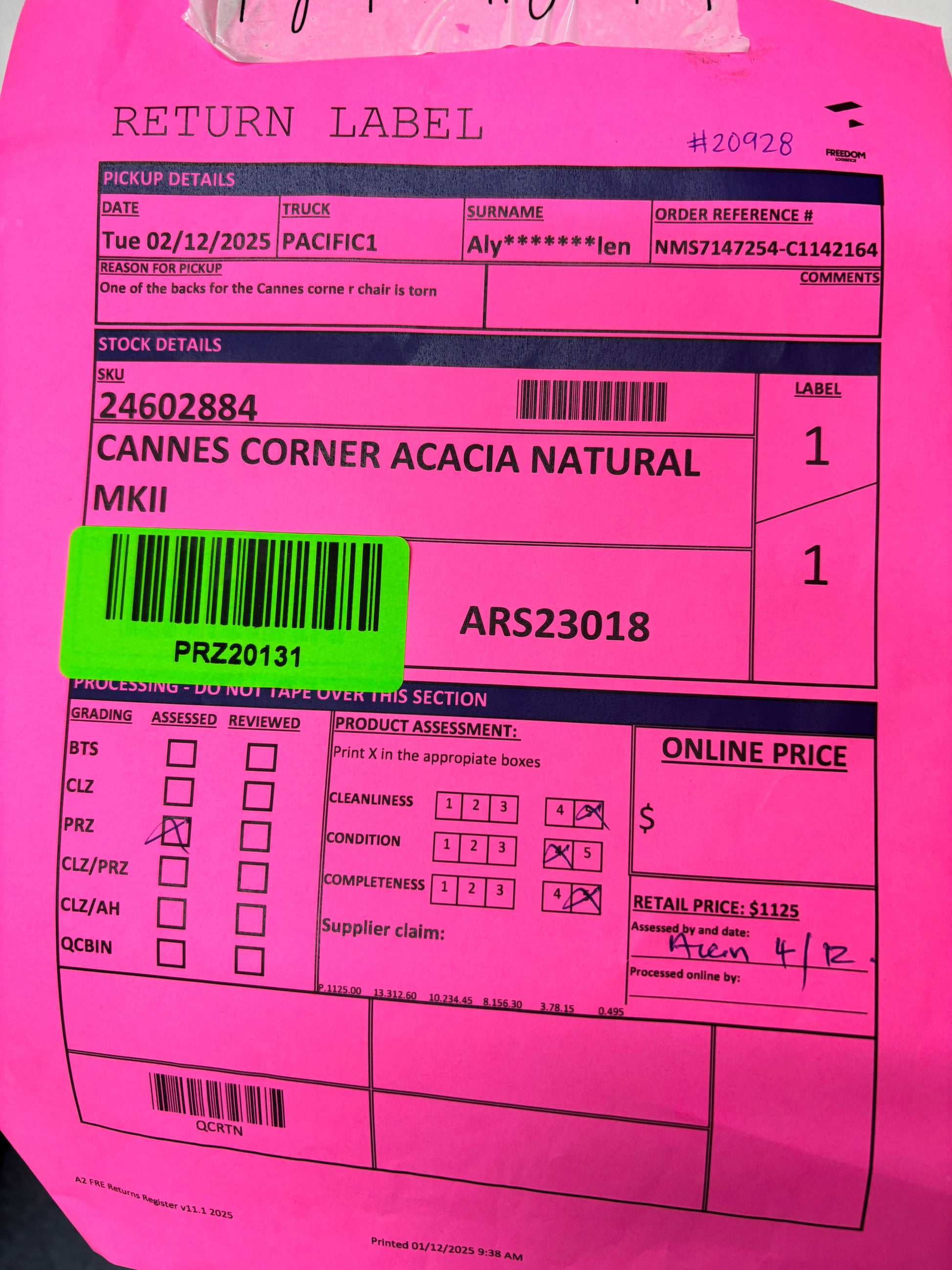 RETURN REASON: One of the backs for the Cannes corner chair is torn